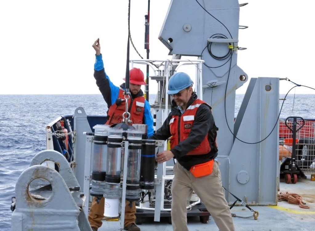 Fig 2. Marine chemist Ken Buesseler (right) deploys a sediment trap from the research vessel Roger Revelle during a 2018 expedition in the Gulf of Alaska. Buesseler’s research focuses on how carbon moves through the ocean. Buesseler and co-authors of a new study found that the ocean’s biological carbon pump may be twice as efficient as previously estimated, with implications for future climate assessments.