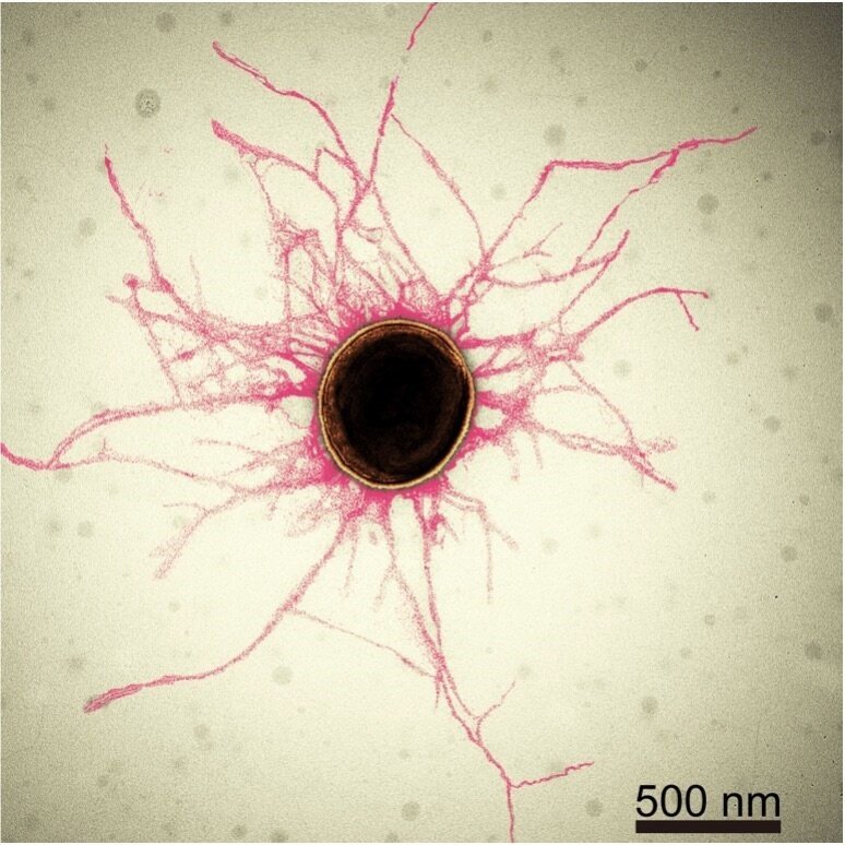 Fig 1. Most bacterial cells are covered in tiny, hair-like structures called pili. Their diameter is smaller than 1/10,000th of a human hair.
